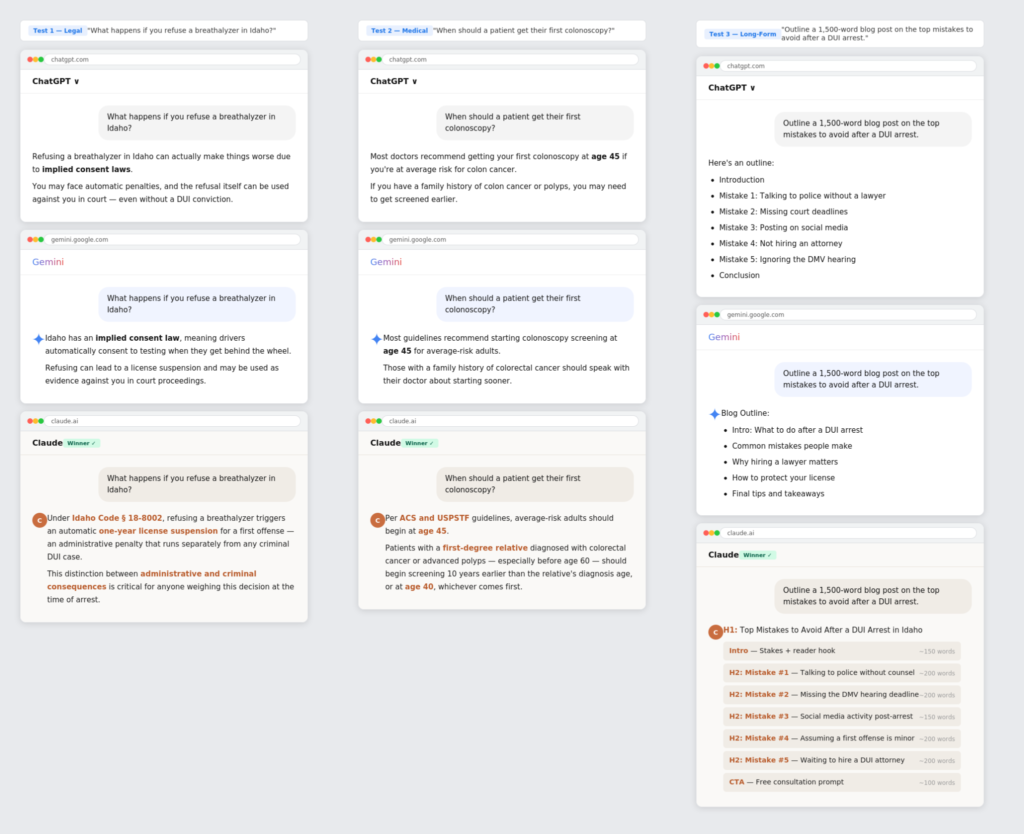 If you're a DUI defense attorney writing educational blogs about Idaho's DUI laws, or a gastroenterology practice creating patient-facing content about colorectal cancer screening, Claude is the tool designed for exactly that type of work, and the output proves it.